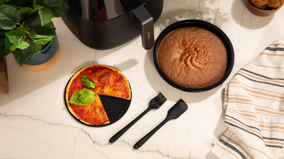 ⭐ Cecofry Bombastik 6000 Full to więcej niż frytkownica. Dzięki zestawowi silikonowych akcesoriów możesz przygotować ciasta, pizzę czy mięso w zdrowej wersji. Kompaktowy design i antypoślizgowa podstawa sprawiają, że urządzenie idealnie sprawdza się w każdej kuchni.